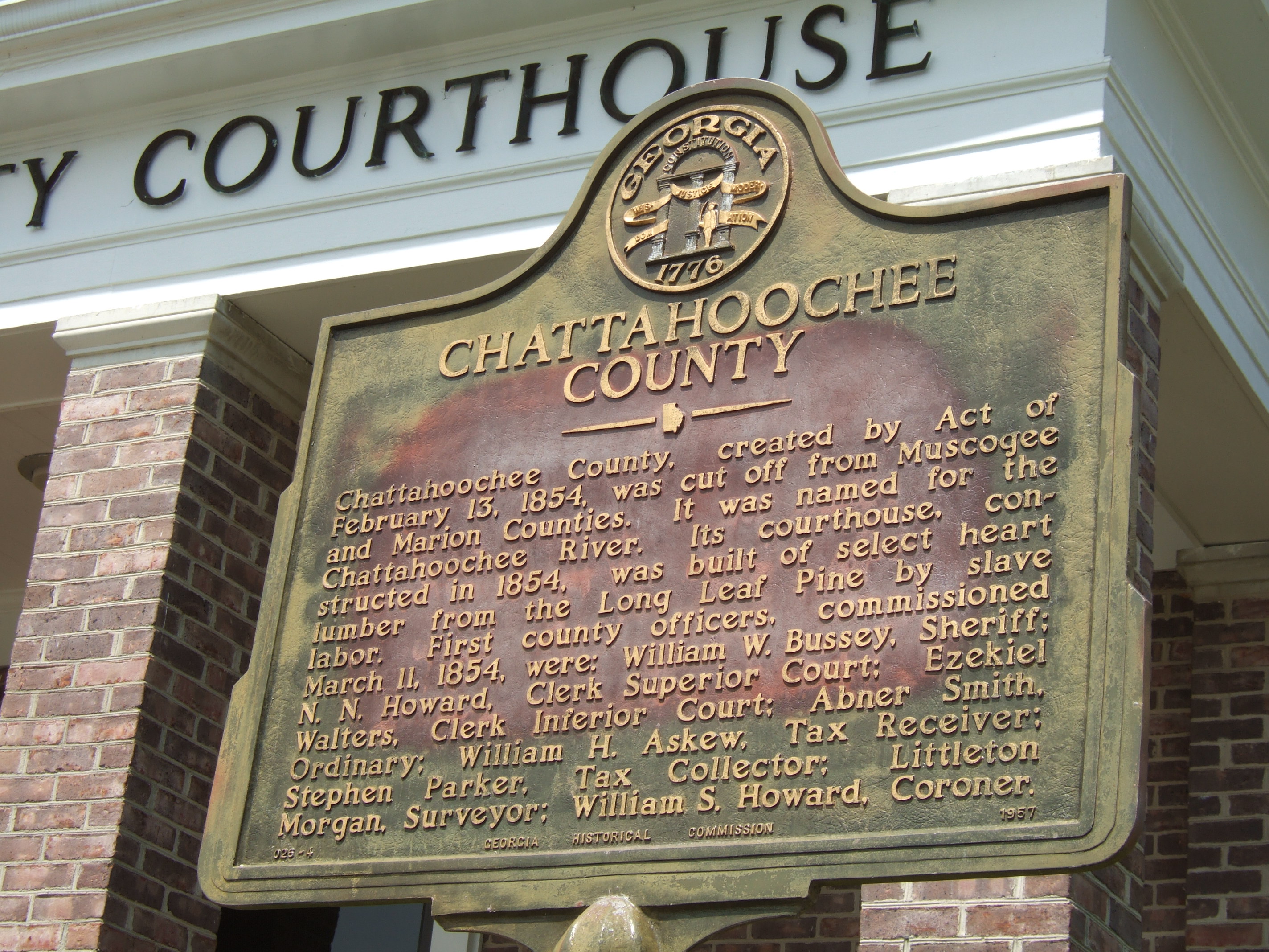 The original Chattahoochee County Courthouse, a two story structure built in 1854 of heart pine using slave labor, was moved to the tourist attraction of Westville near Lumpkin, Georgia in 1975.